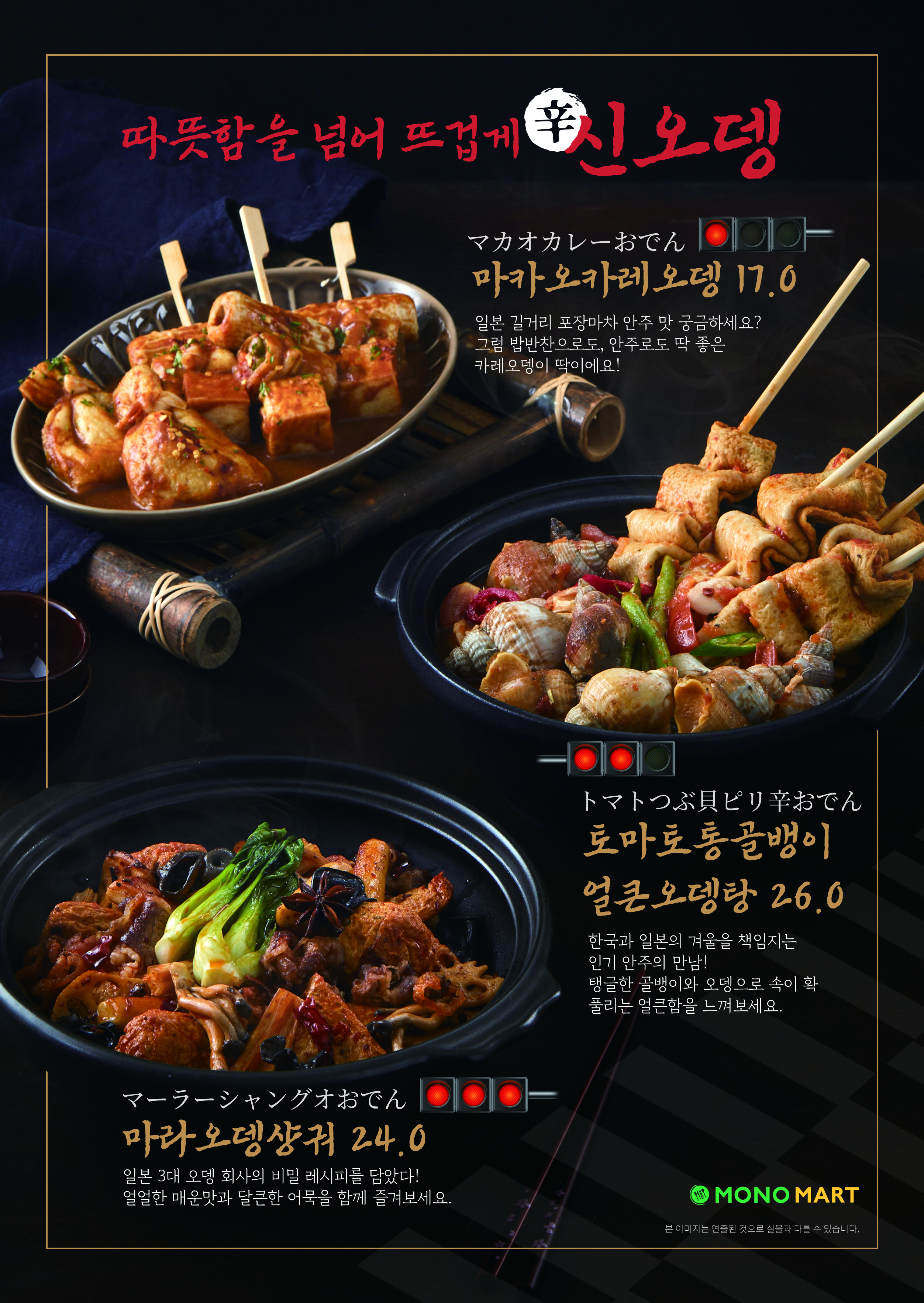 모노마트는 계절변동의 불안정한 요소를 해결하기 위해 동절기 메뉴를 선제적으로 준비하며 외식소상공인들의 겨울 매출 확보에 나섰다. 최근 일본에서도 MZ세대를 중심으로 매운 맛이 인기몰이를 하고 있는 가운데, 지난 6월부터 일본인 현지직원을 통한 시장조사를 토대로 상품 발굴, 메뉴 개발 등을 추진하며 가장 트렌디한 일식 메뉴를 완성했다.
